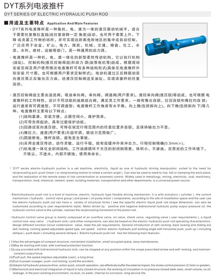 DYT系列電液推桿是一種集機(jī)、電、液為一體的液壓驅(qū)動(dòng)裝置,可廣泛用于冶金、建材、化工、起重運(yùn)輸及港口裝卸機(jī)械中的閥門(mén)、閘門(mén)、換向、傾轉(zhuǎn)、擺動(dòng)等機(jī)械的驅(qū)動(dòng)和控制,可取代傳統(tǒng)的電動(dòng)推桿、液壓缸(由液壓站驅(qū)動(dòng))和氣缸(由氣泵站驅(qū)動(dòng)控制)。